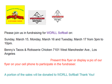 A portion of the sales will be donated to WDRLL Softball Thank You!